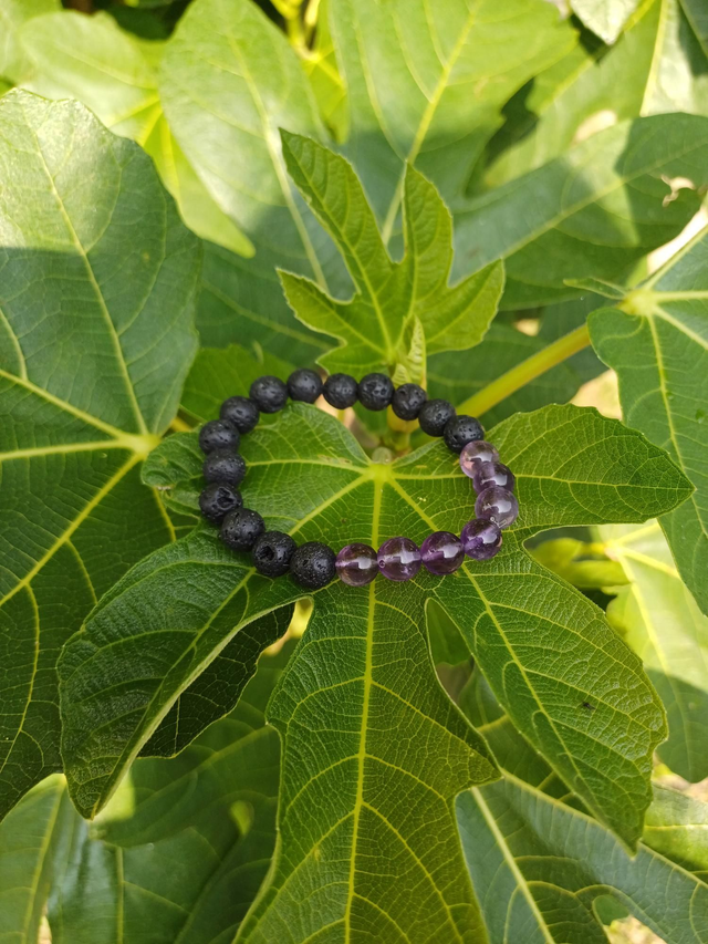 Bracelet en améthyste et pierre de lave avec fiche explicative et son flacon d huille essentielle.